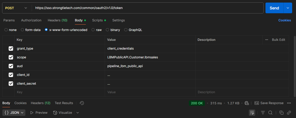 The Public API uses an OAuth2 Endpoint located at: https://sso.strongtietech.com/common/oauth2/v1.0/token Authentication requires a client_id, client_secret, and the Pipeline LBM tenant name. The tenant name is in the Pipeline LBM URL, for example, within https://lb.pipelinebt.app/lbmsales , lbmsales is the tenant name. The tenant name is used to request a scoped JWT token to the LBM tenant and is in the format of: LBMPublicAPI.Customer.<tenant name>