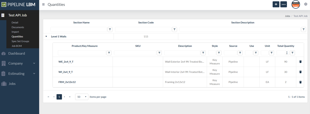 sourceNameis not specified, it will be “Pipeline” by default. Source names can be added via the Job Quantity Source grid on the General Settings page and then specified with thesourceNameproperty for each quantity.We can also verify that the products or key measures were added to the Job on the Quantities page: